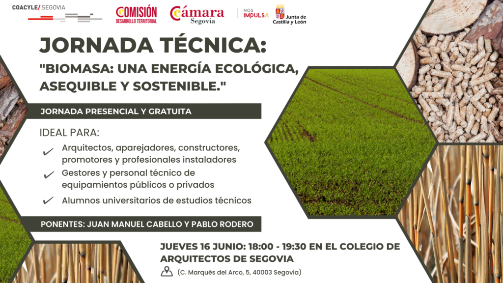 Desde la Cámara de Comercio de Segovia, nos informan de la organización de la Jornada Técnica “BIOMASA: UNA ENERGÍA ECOLÓGICA, ASEQUIBLE Y SOSTENIBLE” para el día 16 de junio de 2022 de 18:00 a 19:30h. en el Colegio de Arquitectos de Segovia.