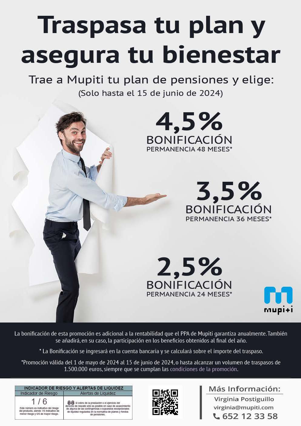Tenemos el placer de informarte de la nueva Promoción de Primavera 2024 para los traspasos de planes de planes de pensiones o PPA que se efectúen desde otra entidad al PPA de Mupiti.