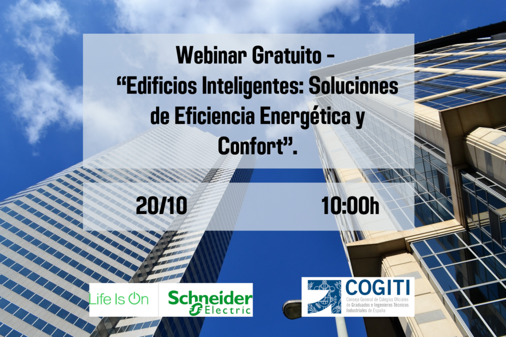 El Consejo General, los Colegios Oficiales y Schneider Electric continuamos con el ciclo de “Los miércoles tecnológicos” presentando el próximo Webinar Gratuito titulado “Edificios Inteligentes: Soluciones de Eficiencia Energética y Confort”, que tendrá lugar el 20 de octubre de 2022 a las 10:00 horas.