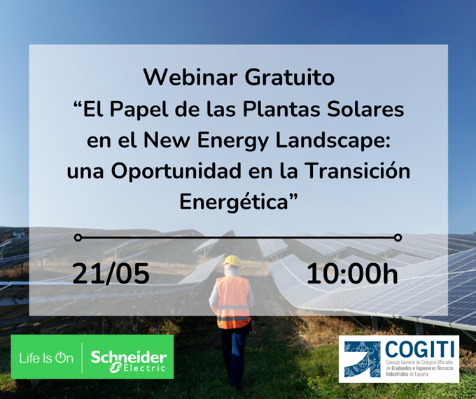 El Consejo General, los Colegios Oficiales y Schneider Electric continúan con el ciclo de “Los miércoles tecnológicos”, y te invitamos a participar en el próximo Webinar Gratuito titulado “El Papel de las Plantas Solares en el New Energy Landscape: una Oportunidad en la Transición Energética”, que se celebrará el 21 de mayo de 2025 a las 10:00 horas.