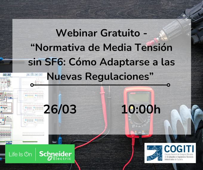 El Consejo General, los Colegios Oficiales y Schneider Electric continuamos con el ciclo de “Los miércoles tecnológicos” presentando el próximo Webinar Gratuito titulado “Normativa de Media Tensión sin SF6: Comó Adaptarse a las Nuevas Regulaciones”, que tendrá lugar el 26 de marzo 2025 a las 10:00 horas.