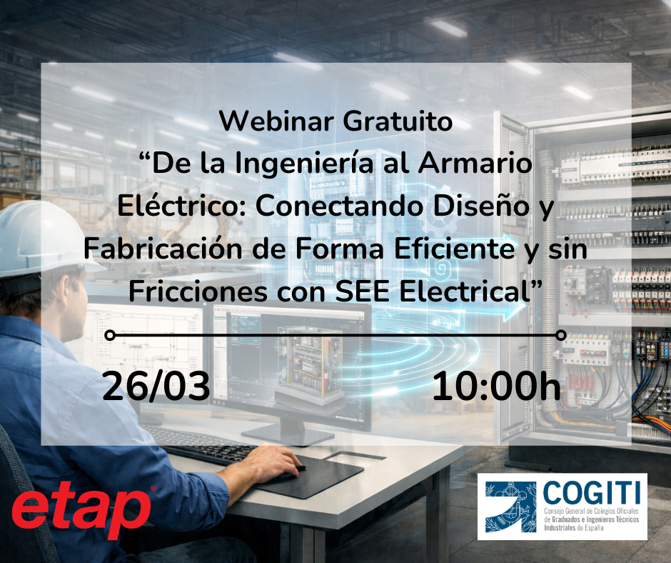 El Consejo General, los Colegios Oficiales y ETAP hemos preparado una jornada virtual para presentar el próximo Webinar Gratuito titulado “De la Ingeniería al Armario Eléctrico: Conectando Diseño y Fabricación de Forma Eficiente y sin Fricciones con SEE Electrical”, que tendrá lugar el 26 de marzo de 2026 a las 10:00 horas.
